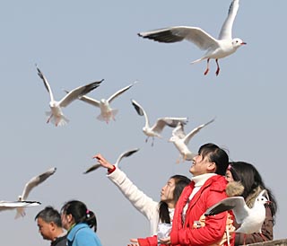 | 昆明市市民來(lái)到滇池邊喂食紅嘴鷗。新華社記者 鄒崢