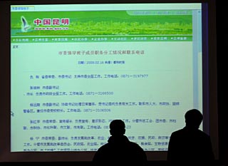 | 昆明市民在電子屏幕前觀看有關(guān)部門(mén)負(fù)責(zé)人的聯(lián)系方式。秦晴