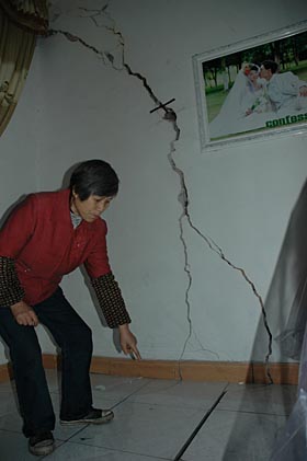 村民在嚴(yán)重沉陷的住房內(nèi).住房嚴(yán)重開裂。 | 采煤負(fù)效顯現(xiàn)