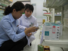 國家食品藥品監(jiān)管局規(guī)定,自今年5月1日起,我國奧運賽事承辦城市藥店需擺放與興奮劑相關(guān)的警示標語;未標注“運動員慎用”字樣的含興奮劑藥品停止銷售。5月1日北京藥監(jiān)系統(tǒng)全員出動開展興奮劑類藥品經(jīng)營專項整治行動。圖為北京市藥監(jiān)局海淀分局的檢查人員在檢查藥品及說明書。