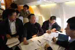 北京時間5月12日14時28分,四川汶川縣發(fā)生7.8級地震,中共中央政治局常委、國務(wù)院總理溫家寶趕往地震災(zāi)區(qū),指揮抗震救災(zāi)工作。這是溫家寶在專機(jī)上研究布置抗震救災(zāi)工作。新華社記者:姚大偉