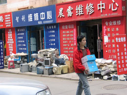 連日來(lái),記者在遼寧省沈陽(yáng)市的街頭發(fā)現(xiàn),總有小商販拿著一個(gè)大喇叭吆喝:“回收舊冰箱、舊彩電、洗衣機(jī)、熱水器……!痹谠撌心虾萍茧娮右粭l街,不到100米的距離內(nèi)有數(shù)位持有“高價(jià)回收廢舊手機(jī)、硒鼓、墨盒”廣告的人。日前,記者在位于沈陽(yáng)市南湖科技電子一條街上的東北大學(xué)科學(xué)園內(nèi),看到一排排銷售電子產(chǎn)品的商鋪林立,個(gè)別商鋪的門前堆積著各種類型的廢舊電腦。一家商鋪的主人告訴記者:“我們不僅賣電子產(chǎn)品,也回收舊電腦、舊打印機(jī)等,每年回收廢舊電子產(chǎn)品的利潤(rùn)不比賣新產(chǎn)品低多少!