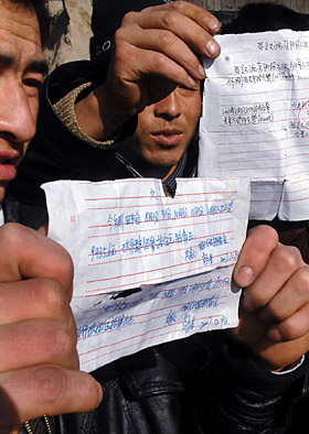 近年來,企業(yè)職工收入分配“強(qiáng)資本、弱勞工”的狀態(tài)十分突出,因而民工欠薪問題屢屢出現(xiàn)。圖為幾位農(nóng)民工正在出示他們的欠款“白條”。新華社記者