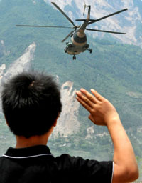 直升機為抗震救災作出了突出貢獻,贏得了災區(qū)人民的崇敬。新華社記者:楊俊江 攝 |