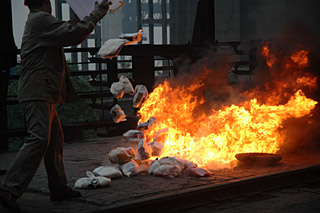 6月22日,重慶鋼鐵廠的工人將毒品倒入焚燒爐入口。這是重慶首次以環(huán)保方式焚燒毒品。 與過去露天公開焚燒毒品的方式相比,采用鋼鐵廠的焚燒爐焚燒毒品,所排出的煙氣和粉塵不含毒品成分,符合焚燒爐排放標準,最大限度降低了對環(huán)境的影響。新華社記者