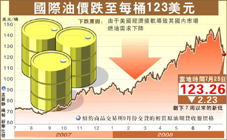 7月25日,國(guó)際幾大石油交易市場(chǎng)的表現(xiàn)創(chuàng)下了一段時(shí)間以來(lái)的價(jià)格新低。當(dāng)天,紐約商品交易所9月份交貨的輕質(zhì)原油期貨價(jià)格開(kāi)盤后一路下跌,觸底至每桶122.50美元,收盤時(shí)報(bào)于123.26美元,比前一個(gè)交易日下跌了2.23美元。倫敦國(guó)際石油交易所9月份交貨的北海布倫特原油期貨價(jià)格下跌1.92美元,收于每桶124.52美元。 此外,紐約商品交易所8月份交貨的汽油期貨價(jià)格每加侖下跌2.71美分,收于3.0323美元;8月份交貨的取暖油期貨價(jià)格每加侖下跌4.42美分,收于3.5229美元;8月份交貨的天然氣期貨價(jià)格每千立方英尺下跌19.9美分,收于9.084美元。 業(yè)界普遍認(rèn)為,此輪油價(jià)回落是由于美國(guó)經(jīng)濟(jì)疲軟導(dǎo)致其國(guó)內(nèi)市場(chǎng)燃油需求下降。美國(guó)能源部上周發(fā)布報(bào)告顯示,目前美國(guó)國(guó)內(nèi)市場(chǎng)對(duì)燃油的平均日需求量降到了2007年1月以來(lái)的最低水平。 與此同時(shí),市場(chǎng)初步估算7月份石油輸出國(guó)組織(歐佩克)原油日產(chǎn)量比上月增加了20萬(wàn)桶,緩解了投資者對(duì)原油供應(yīng)的擔(dān)心。歐佩克第一大產(chǎn)油國(guó)沙特在過(guò)去兩個(gè)月中連續(xù)兩次增產(chǎn),試圖抑制油價(jià)猛漲的趨勢(shì)。