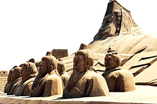 寧夏沙湖風(fēng)景區(qū)邀請沙雕藝人就地取材,把一座座黃沙丘變成了一組組精美的沙雕作品,吸引了海內(nèi)外眾多游客的目光。 | 向沙漠要效益