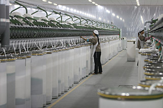 浙江長興縣威達紡織集團工人正在操作先進的自動化設(shè)備。威達紡織集團擁有國際最先進的德國Autocoro312型氣流紡設(shè)備,年產(chǎn)各類紗線10000噸,產(chǎn)品遠銷歐洲、美國、日本、巴基斯坦、土耳其、香港等地。新華社記者