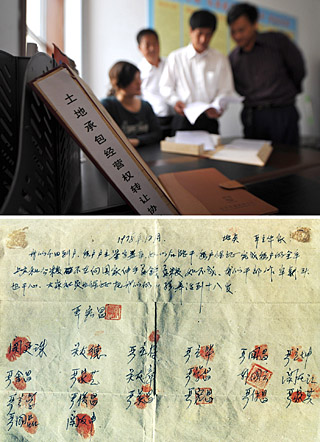 30年前,安徽省鳳陽縣小崗村的18位農(nóng)民在一紙分田到戶“大包干”生死契約上按下鮮紅的手印,從此拉開了中國農(nóng)村改革的序幕。近年來,小崗村開始進(jìn)行以承包制為基礎(chǔ)的土地流轉(zhuǎn)制度改革,開展多種形式的土地集中經(jīng)營,探索致富之路。 |