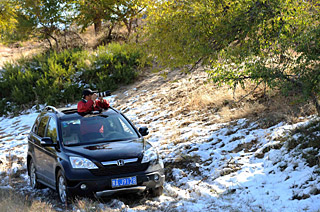| 一名自駕車旅游者在秋雪過后的克什克騰草原上拍攝。新華社記者 張領(lǐng)