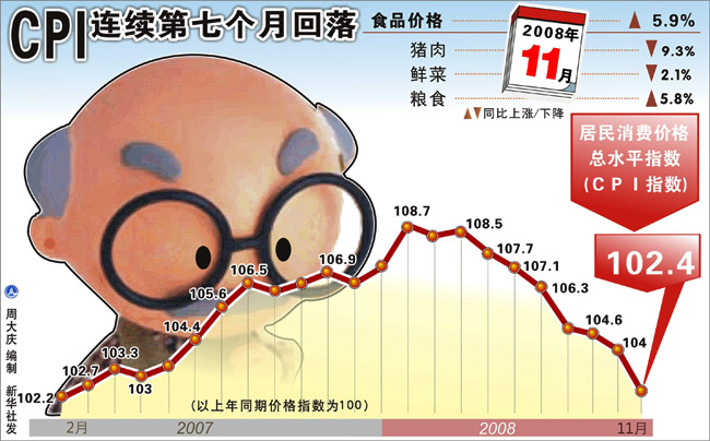 國家統(tǒng)計局11日公布,11月份中國消費價格指數(shù)(CPI)同比上漲2.4%,漲幅比上月快速回落1.6個百分點。今年以來,我國CPI已經(jīng)連續(xù)7個月回落,并創(chuàng)下自2007年2月以來近22個月以來的新低。加上10日公布的11月份生產(chǎn)資料價格(PPI)增幅跳水4.6個百分點,專家認為當前中國面臨的通貨緊縮壓力正在增加。