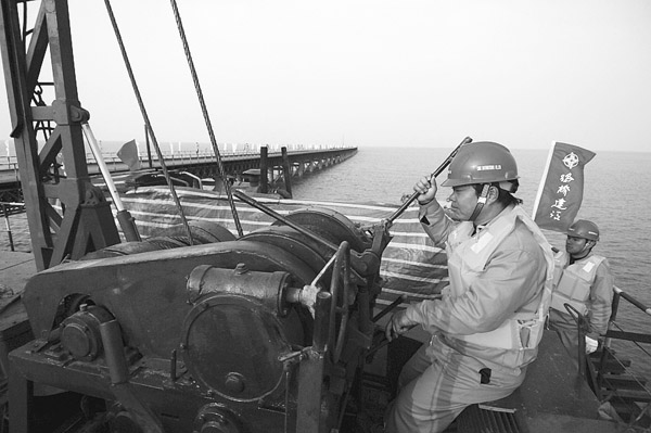 12月15日,建筑工人在吊裝世博會(huì)演藝中心鋼架結(jié)構(gòu)。