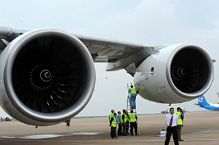 被譽為“空中巨無霸”的空客A380型客機在珠海機場參加今年的第七屆珠海航展。新華社記者 周文杰