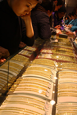 1月2日,顧客在北京一家首飾店里選購黃金飾品。這家商店節(jié)日期間一天首飾飾品銷售營業(yè)額高達500多萬元,是平日的五倍。新華社記者