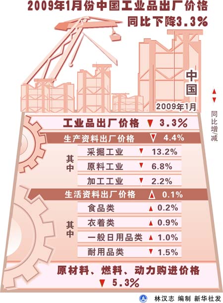 1月份PPI降幅比上月擴(kuò)大2.2個百分點,出乎絕大多數(shù)研究人員的預(yù)料。原因何在?國家統(tǒng)計局給出了兩點解釋: 一是美國金融危機(jī)引起全球?qū)嶓w經(jīng)濟(jì)快速下滑,國際市場原油、礦石、糧食等基礎(chǔ)性產(chǎn)品價格顯著下降,致使我國此類大宗產(chǎn)品進(jìn)口價格明顯下降,進(jìn)而引起去年持續(xù)處于高位的生產(chǎn)資料價格下降較多,并通過產(chǎn)業(yè)鏈條逐漸往中下游傳導(dǎo),導(dǎo)致主要類別產(chǎn)品價格的全面走低。比如,1月份,國際市場上非能源價格同比下降25.5%,降幅比12月份擴(kuò)大1.2個百分點;金屬價格下降41.4%,擴(kuò)大5個百分點,其中鋁價下降42.2%,擴(kuò)大5.3個百分點。 二是去年價格高企的負(fù)滯后影響。2008年工業(yè)品出廠價格前8個月漲幅逐漸擴(kuò)大,形成了一個較高的基數(shù)平臺,9月份以后工業(yè)品出廠價格開始環(huán)比下降,2008年12月份的平均價格水平已低于2008年1月份的水平,致使2008年的工業(yè)品價格變動對2009年的滯后影響為負(fù),全年大約為負(fù)4.3個百分點。其中,2008年對2009年1月份的滯后影響大約為負(fù)1.5個百分點,并且這種負(fù)的滯后影響在2009年8月份以前還將逐月擴(kuò)大。因此,即使2009年工業(yè)品價格不再下降,全年的工業(yè)品價格同比漲幅仍然為負(fù),表現(xiàn)為2009年工業(yè)品價格同比指數(shù)的明顯下降。 另外,統(tǒng)計局強(qiáng)調(diào),從分類上看,PPI價格有漲有落。在工業(yè)品出廠價格中,盡管黑色金屬冶煉及壓延加工業(yè)出廠價格和有色金屬冶煉及壓延加工業(yè)出廠價格同比分別下降7.2%和24.6%,但煤炭開采和洗選業(yè)出廠價格同比上漲22.7%,其中原煤出廠價格上漲12.3%;汽油、煤油出廠價格分別上漲2.1%和3.1%。
