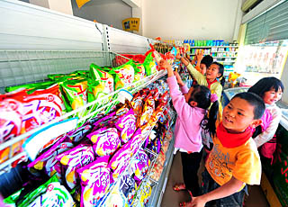 3月11日,大密羅村的幾名小學(xué)生在村中“小超市”購買小食品。云南省玉溪市供銷系統(tǒng)所屬百信商貿(mào)集團,從2008年開始,補貼相關(guān)費用在該市農(nóng)村建立村級“小超市”!靶〕小辈扇〗y(tǒng)一價格、統(tǒng)一標(biāo)識、統(tǒng)一物流配送及售賣方式,按批發(fā)價向村民零售貨物,農(nóng)民足不出村,即可買到實惠的日常用品。目前,這種鄉(xiāng)村“小超市”已經(jīng)覆蓋了玉溪市約25萬農(nóng)村消費人群。新華社記者