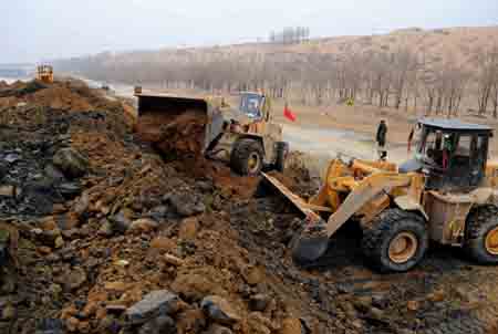 3月11日,在黃河內(nèi)蒙古達(dá)拉特旗昭君墳段,工程機械正在打堤壩,建造蓄滯洪區(qū)。 為減輕黃河內(nèi)蒙古段防凌壓力,內(nèi)蒙古自治區(qū)在黃河南岸的杭錦旗和達(dá)拉特旗搶修3處分凌蓄滯洪區(qū),以預(yù)防可能到來的特大凌汛。據(jù)介紹,這3個蓄滯洪區(qū)可分凌近1.4億立方米。