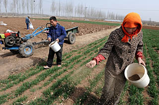 山東萊西市孫受鎮(zhèn)郭家莊村民何貴芳(右)正在為長(zhǎng)勢(shì)偏弱的麥田增施速效肥,以利于增加分蘗和壯苗。新華社記者 李紫恒