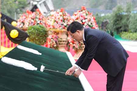 5月12日,紀(jì)念四川汶川特大地震一周年活動在汶川縣映秀鎮(zhèn)隆重舉行。紀(jì)念活動上,胡錦濤總書記深情俯下身子,將一枝潔白的菊花敬獻(xiàn)在四川汶川特大地震記事墻前,深切思念在地震中不幸罹難的同胞和在抗震救災(zāi)斗爭中英勇獻(xiàn)身的烈士。新華社記者:李學(xué)仁 攝