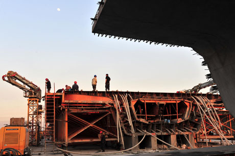 由山東高速集團(tuán)投資建設(shè)的青島海灣大橋鋼箱梁加工與制造第一、二合同段鋼箱梁總拼裝基地,日前在青島四方港區(qū)建成正式投產(chǎn)。這一基地是目前國(guó)內(nèi)最大的鋼箱梁總拼裝基地。 圖為工人在進(jìn)行標(biāo)準(zhǔn)梁段拼裝焊接。