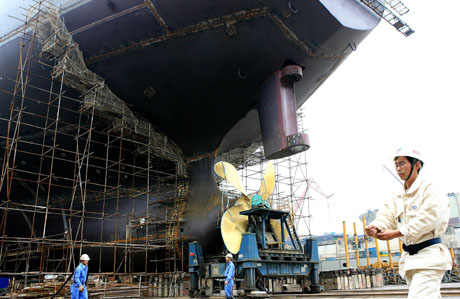 因國(guó)際金融危機(jī)持續(xù)沖擊,全球經(jīng)濟(jì)增速減慢,加上受墨西哥和美國(guó)等國(guó)相繼爆發(fā)的甲型HINI流感疫情的影響,今年5月上海港航運(yùn)經(jīng)濟(jì)回暖步伐明顯放緩,出入境(港)國(guó)際航運(yùn)船舶數(shù)量環(huán)比分別增長(zhǎng)0.21%和1.1%。圖為上海港港區(qū)內(nèi)的船廠工人在船塢內(nèi)工作。