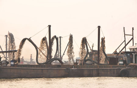 采砂船6月13日在長江江蘇南京龍?zhí)抖畏欠ú缮啊?nbsp; 為防止采砂導致江岸坍塌,長江江蘇段嚴格禁止各種采砂行為,然而受暴利驅使,非法采砂時有發(fā)生,往日多為夜間偷采,這種大白天明目張膽非法采砂卻很罕見。此采砂點緊靠一集裝箱碼頭,距2008年11月18日發(fā)生的江岸大面積坍塌現場不足1000米。