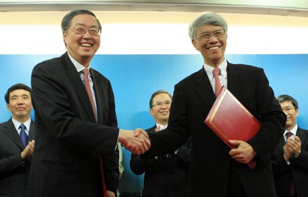 6月29日,中國人民銀行行長周小川(前左)和香港金融管理局總裁任志剛在備忘錄簽署儀式上。當(dāng)日,內(nèi)地與香港跨境貿(mào)易人民幣結(jié)算業(yè)務(wù)備忘錄在香港簽署。新華社記者