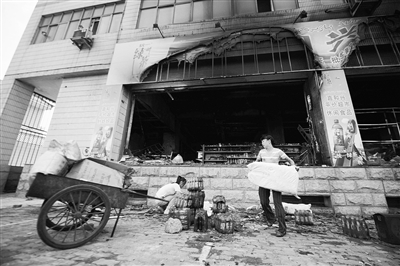 7月6日,烏魯木齊市一家超市的經(jīng)營(yíng)者在自己被焚毀的商店外整理貨物。