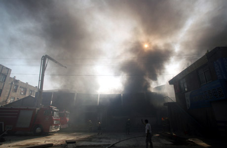 8月13日,位于濟南市北園大街東段的一個五交化倉庫起火,冒出滾滾濃煙。接到報警后,當地消防部門出動官兵趕往現(xiàn)場實施滅火。經過2個多小時的努力,火勢得到控制,所幸大火沒有造成人員傷亡。目前起火原因正在調查中。新華社發(fā)