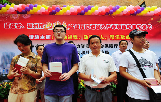 9月14日,福建省、市、區(qū)領(lǐng)導(dǎo)為就業(yè)困難人員發(fā)放福建省第一批《就業(yè)失業(yè)登記證》及政策宣傳手冊(cè)。當(dāng)日,“福建省、市2009年迎國慶就業(yè)援助進(jìn)家入戶專項(xiàng)活動(dòng)”在福州市中山社區(qū)舉辦啟動(dòng)儀式。福州市四城區(qū)公共就業(yè)服務(wù)機(jī)構(gòu)及其42街道(鄉(xiāng)鎮(zhèn))297個(gè)社區(qū)勞動(dòng)保障機(jī)構(gòu)代表400多人參加啟動(dòng)儀式。據(jù)了解,就業(yè)援助、進(jìn)家入戶專項(xiàng)活動(dòng)主題為:援助進(jìn)家,政策到人,幫您就業(yè);顒(dòng)為期半個(gè)月。 |