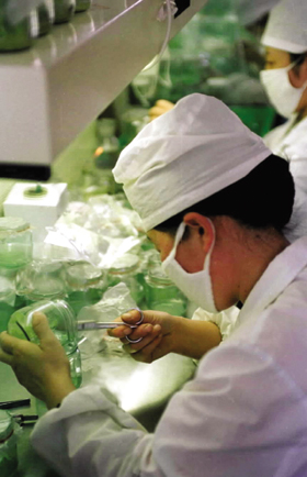 馬鈴薯工程技術(shù)研究中心工作人員在研究室培育馬鈴薯脫毒薯苗。本報(bào)記者 梁強(qiáng)