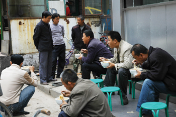 記者的朋友老張就是一名地道的蘭州牛肉拉面迷,一早起來,就直奔牛肉拉面店。交錢、排隊(duì),端出一大碗香噴噴的清湯面,調(diào)入一勺紅亮的辣椒油,再澆上醋,偶爾再切點(diǎn)牛肉,要個(gè)茶雞蛋,然后或蹲、或站、或端坐,連湯帶面吃個(gè)底朝天,一天都精精神神。