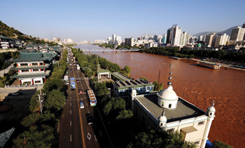 從纜車上拍攝的黃河及蘭州市區(qū)。本報(bào)記者 韓傳號/攝 |