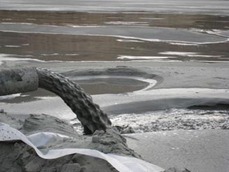 中國五礦邯邢局兩家鐵礦2008年8月28日取得由河北省安全生產(chǎn)監(jiān)督管理局頒發(fā)的“安全生產(chǎn)許可證”。然而,這兩家鐵礦卻早在2007年就開始向尾礦庫非法排尾。圖為2007年11月,北洺河鐵礦的排尾管道在向尖山北尾礦庫排尾。張春華