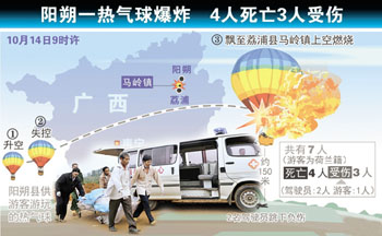 14日6時30分左右,發(fā)生事故的熱氣球從廣西陽朔縣紅旗碼頭起飛,上面載著2名中國男性駕駛員和5名荷蘭籍游客,游客為3男2女。7時45分左右飛到荔浦縣馬嶺鎮(zhèn)德安村山面屯上空,在降落過程中,發(fā)生傾斜,熱氣球上的氣瓶發(fā)生漏氣燃燒,熱氣球失控上升,后熱氣球燃燒墜毀,從熱氣球上摔落山坡上的2男2女當(dāng)場死亡,均為荷蘭籍游客。另外掉在樹上的2名中國男性駕駛員和1名荷蘭籍男性游客幸免于難。