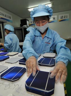 一位工人正在溫嶺市寶利特新能源公司車(chē)間里工作。浙江部分傳統(tǒng)企業(yè)進(jìn)軍新能源產(chǎn)業(yè)。寶利特等傳統(tǒng)制鞋企業(yè)轉(zhuǎn)產(chǎn)研發(fā)太陽(yáng)能電池片和組件,企業(yè)年生產(chǎn)能力超過(guò)20兆瓦。新華社浙江分社供稿 |