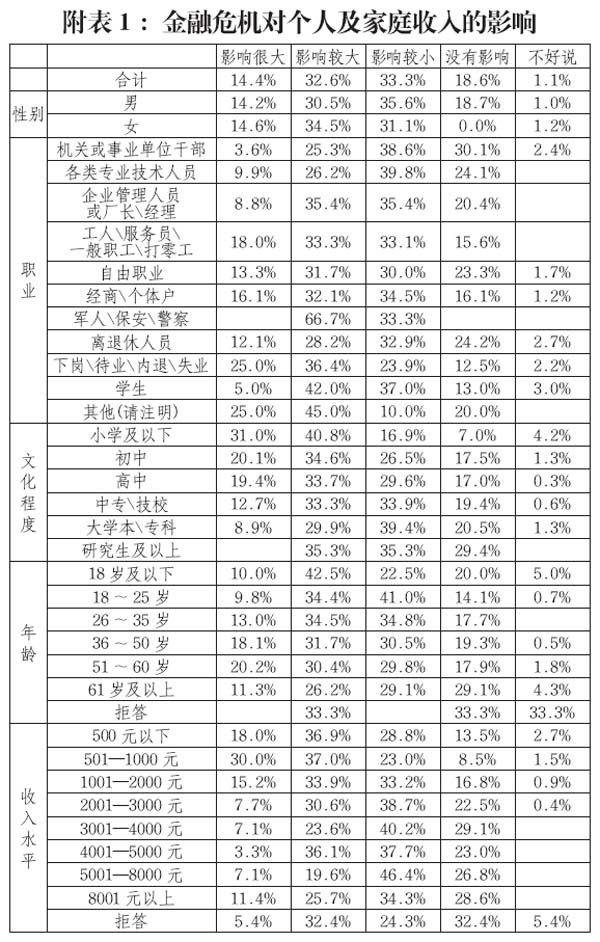 .6%的被訪者認為金融危機對于求職/就業(yè)影響很大,其中56.1%的學(xué)生對此感受明顯。不同文化程度的被訪者中,33.8%的高中學(xué)歷被訪者、32.1%的研究生認為金融危機對求職/就業(yè)影響很大。個人月收入在1000元以下的被訪者認為金融危機對求職就業(yè)的影響更大。 H、收入 48.6%的被訪者認為金融危機對收入有一定影響,其中15.5%的被訪者認為影響很大。從職業(yè)方面看,下崗/失業(yè)/內(nèi)退/待業(yè)(38.3%),經(jīng)商/個體戶(23.3%)有更高的比例認為金融危機對收入影響很大。月收入在1000元以下的城市被訪者感覺收入受金融危機影響更大。 I、投資理財 53.5%的被訪者認為金融危機在一定程度上影響到了個人和家庭的投資理財。其中26%的被訪者認為影響很大。從職業(yè)方面來看,自由職業(yè)者(28.9%)、下崗/失業(yè)/內(nèi)退/待業(yè)人員(41.3%)認為金融危機對投資理財影響更大。61歲以上被訪者感覺投資理財受到金融危機影響更大。個人月收入在2000元以下的被訪者感覺金融危機對投資理財?shù)挠绊懜蟆?BR> 3、超七成城市居民工資沒有受到金融危機的負面影響;62.3%的被訪者財產(chǎn)性收入在金融危機中有所減少。 在2009年的一年間,20.5%的被訪者表示有所增加,56.6%的被訪者表示收入和以前一樣,22.9%的被訪者表示收入有所減少。收入大幅增加和大幅減少的比例分別是0.9%和4.9%,可見年內(nèi)城市居民的工資收入情況比較穩(wěn)定。 城市居民的財產(chǎn)性收入(例如,股票債券、投資性購房、房屋租賃收入等)方面,37.7%的被訪者認為收入沒變化或有所增加,62.3%的人表示收入有所減少,可見金融危機對于城市居民的財產(chǎn)性收入影響較大。 4、金融危機在一定程度上影響了城市居民的日常生活。 在減少聚會/外出就餐次數(shù)、家庭大件消費、旅游消費,以及縮減用于投資/理財?shù)腻X、銀行儲蓄,降低買房、買車的可能性方面,均有接近或超過4成的被訪者表示認同。 不過在日常消費、文化娛樂服務(wù)支出方面,雖然有相當(dāng)比例的被訪者表示減少了開支,但是近半數(shù)被訪者表示金融危機對這兩方面支出沒有影響。 5、28.1%的被訪者認為經(jīng)濟危機直接引發(fā)了就業(yè)危機。 在金融危機對于創(chuàng)業(yè)、就業(yè)的影響方面,28.1%的被訪者認為經(jīng)濟危機直接引發(fā)了就業(yè)危機。 有意思的是,17.6%的被訪者認為“金融危機為個人創(chuàng)業(yè)帶來了機會”,15.4%的被訪者則認為“金融危機使個人創(chuàng)業(yè)變得困難”。金融危機給城市居民的個人創(chuàng)業(yè)帶來了不同的觀感。 此外,11