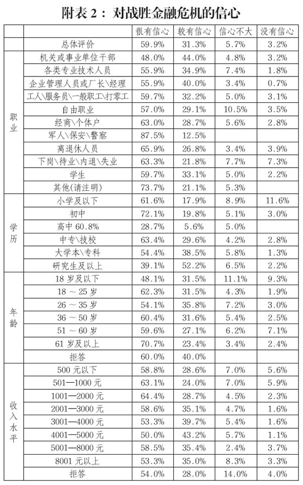 近2成的城市居民比較了解金融危機;但對于我國應(yīng)對金融危機的措施,僅有2.8%的受訪農(nóng)民表示非常了解,絕大多數(shù)只是知道一點,更有17.5%的受訪農(nóng)民表示對相關(guān)措施“一點也不知道”。