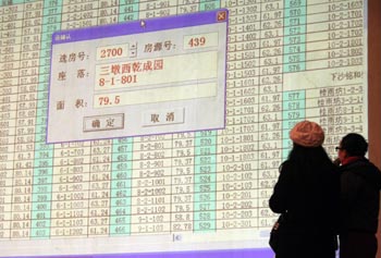 1月10日,選房的杭州市民在大屏幕前挑選經(jīng)濟適用房。 當日,杭州新年第一次經(jīng)濟適用房公開選房在杭州藝術學校舉行。據(jù)了解,本期經(jīng)濟適用房房源總計套數(shù)600套,總建筑面積4.03萬平方米,主要分布在丁橋和三墩。新華社發(fā) |