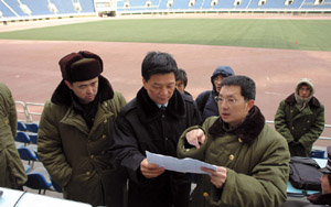 奧運項目組負(fù)責(zé)人在現(xiàn)場向奧組委技術(shù)部領(lǐng)導(dǎo)匯報工作 |