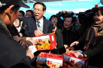 2009年1月14日,浙江衢州市委書記孫建國在杭州幫助橘農(nóng)推銷柑橘。為了幫助衢州橘農(nóng)順利度過“銷售寒冬”,浙江省農(nóng)業(yè)廳和衢州市政府在杭州的浙江農(nóng)展館廣場(chǎng)舉辦衢州柑橘杭州專場(chǎng)促銷會(huì),衢州市委書記孫建國帶領(lǐng)百名橘農(nóng)到現(xiàn)場(chǎng)叫賣柑橘。