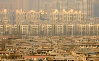 石家莊一個城中村與遠(yuǎn)處高樓相映襯,城中村由于租房價格低廉成為很多低收入家庭的聚居區(qū),而樓房則是他們中很多人遙不可及的夢想。新華社記者 鞏志宏