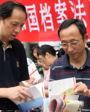 2007年9月5日,上海舉行紀念《中華人民共和國檔案法》頒布20周年檔案宣傳咨詢活動,此次活動面向公眾宣傳檔案法律知識,開展檔案便民活動。上海各級檔案館當時已總計開放檔案180余萬卷,在史料展示、信息公開、便民服務等方面發(fā)揮了重要作用。新華社記者劉穎/攝 |