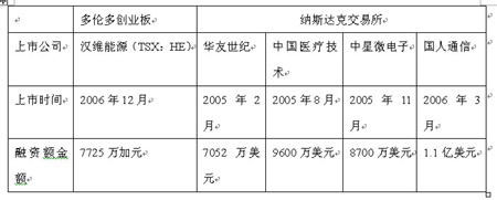 經(jīng)過密集的連續(xù)融資,公司總共融資7725萬加元,按照當(dāng)時的匯率,超過了人民幣5億元,其規(guī)模與當(dāng)期赴納斯達(dá)克的中國明星企業(yè)比毫不遜色(見下表對比)。由于漢維能源優(yōu)異的業(yè)績,公司在2個月后升板到TSX主板。