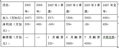 漢維公司2007年1季度公司業(yè)績表現(xiàn)不佳,而后續(xù)季度業(yè)績突飛猛進(jìn),正是其業(yè)績上表現(xiàn)出強(qiáng)力支撐,當(dāng)期的財務(wù)數(shù)據(jù)表現(xiàn)靚麗,從而使后續(xù)融資非常順利。詳見下表: