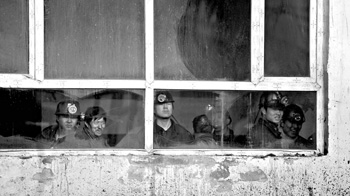 幾名礦工在救援現(xiàn)場等待參加救援。資料照片 |