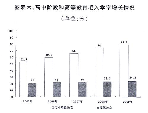 各項社會事業(yè)全面進步。社會事業(yè)基礎設施建設得到加強,2008年四季度以來,中央政府用于社會事業(yè)發(fā)展方面的基建投資550多億元,超過“十五”時期的總和。城鄉(xiāng)免費義務教育政策全面落實,中西部地區(qū)農村初中校舍改造和全國中小學校舍安全工程積極推進,改造農村初中校舍面積670萬平方米,建成中等職業(yè)學校和特殊教育學校校舍314萬平方米。初中階段三年保留率達到94%,提高0.3個百分點,高中階段毛入學率達79.2%,提高5.2個百分點,超過計劃2.2個百分點;普通高校招生639.5萬人,增加31.8萬人,超過計劃10.5萬人,研究生招生51.1萬人,增加6.5萬人,超過計劃3.6萬人;鶎俞t(yī)療衛(wèi)生服務體系和計劃生育設施建設繼續(xù)加強,建成17171個基層醫(yī)療衛(wèi)生服務機構、4522個基層計劃生育服務項目,甲型H1N1流感防控工作依法科學有序進行。人口自然增長率5.05‰,實現了7‰以內的計劃目標。國家博物館、國家圖書館二期等重大文化項目建設進展順利,建成鄉(xiāng)鎮(zhèn)綜合文化站5062個,免費開放的博物館、美術館、圖書館等公共文化設施1444家。廣播、電視人口覆蓋率分別達到96.3%和97.2%,廣播電視村村通工程提前一年完成“十一五”規(guī)劃任務。紅色旅游精品景區(qū)建設規(guī)劃目標全面實現。哲學社會科學、新聞出版、文學藝術和體育等事業(yè)繁榮發(fā)展。第十一屆全國運動會成功舉辦。上海世博會園區(qū)建設基本完成。