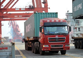 防城港物流卡車在裝運集裝箱。新華社記者