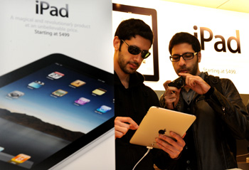 4月3日,兩位顧客在位于紐約曼哈頓第五大道的蘋果專賣店體驗(yàn)iPad。新華社記者 申宏