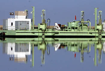 柴達(dá)木盆地內(nèi)察爾汗鹽湖上,青海鹽湖集團(tuán)生產(chǎn)廠區(qū)內(nèi)先進(jìn)的采鹽船。記者 侯德強(qiáng)/攝